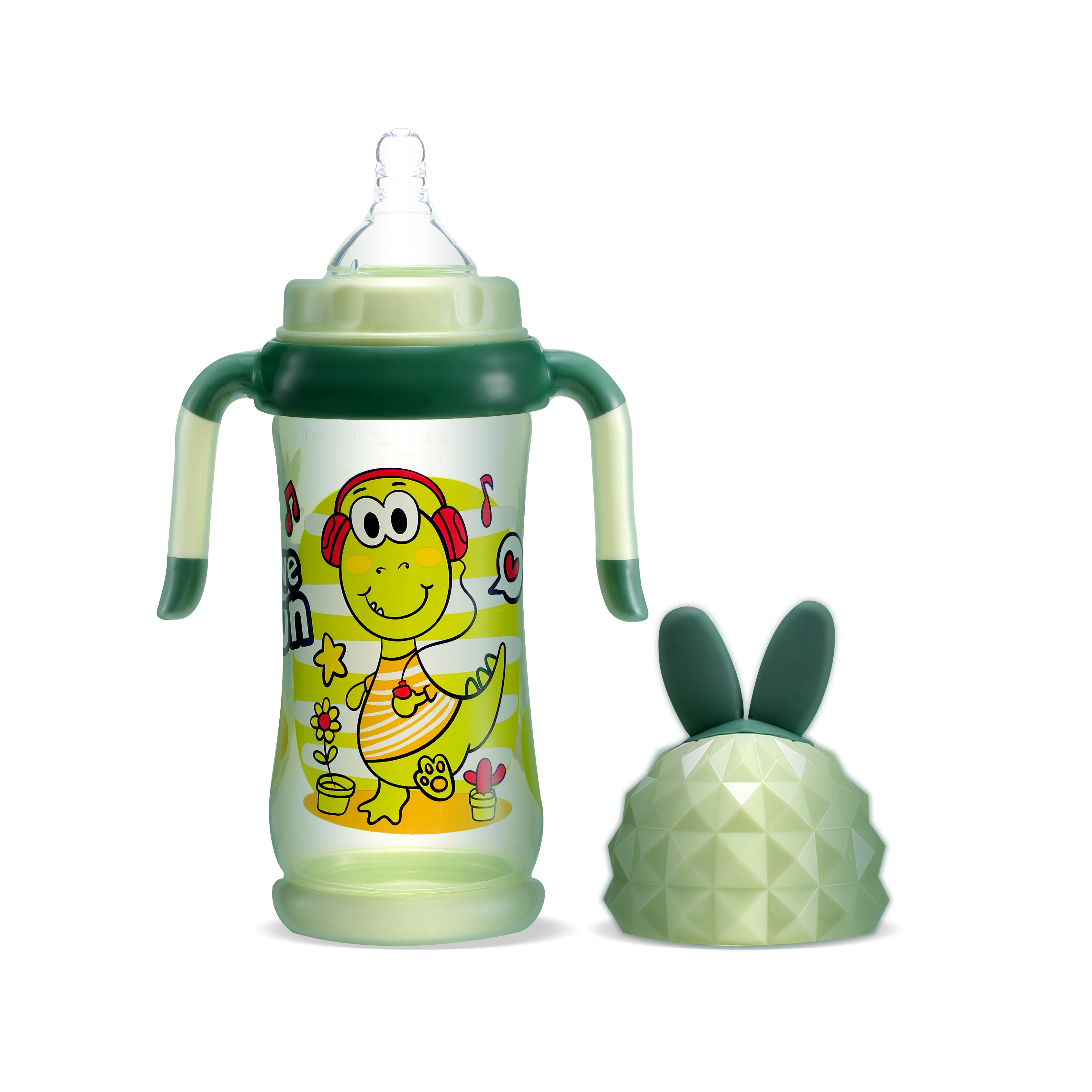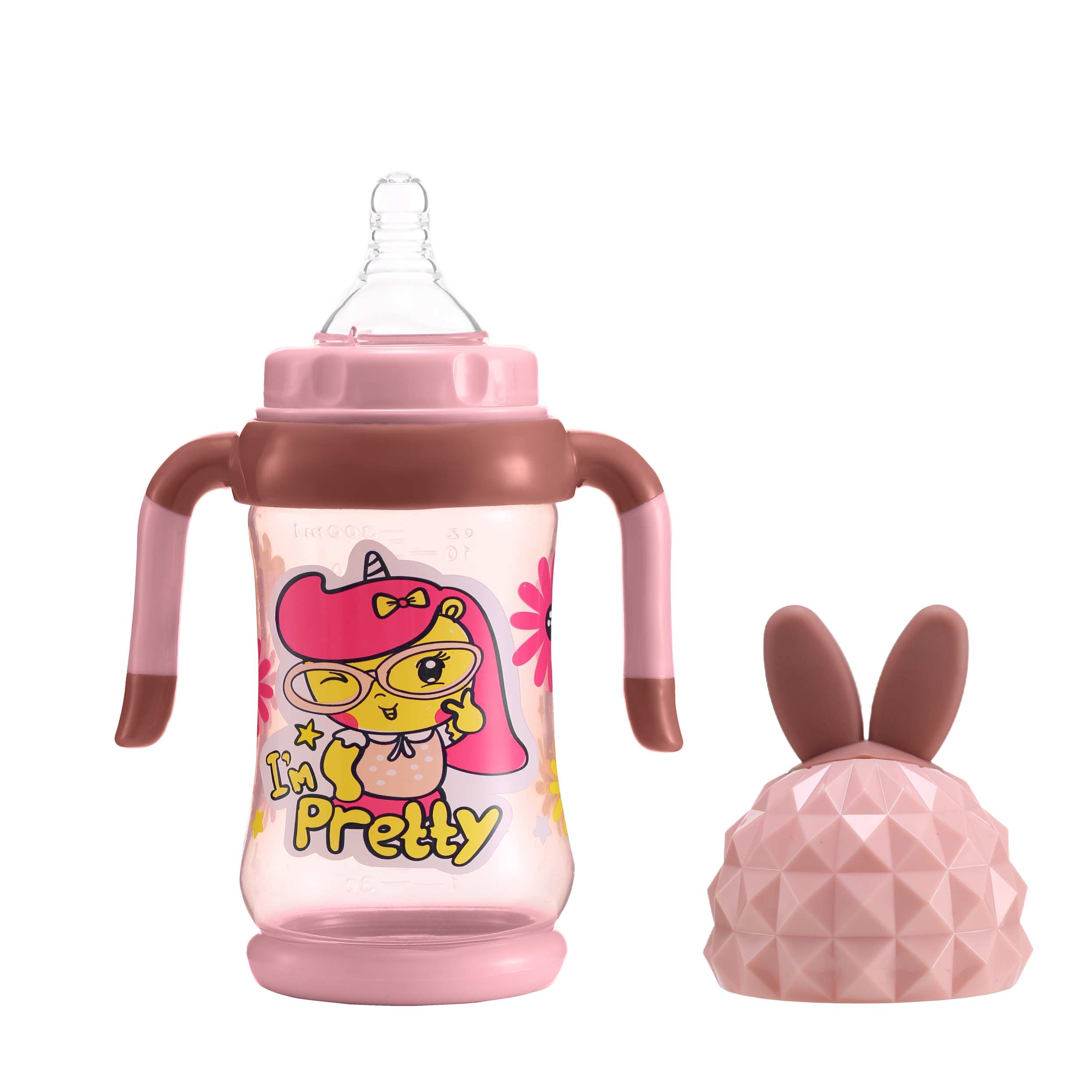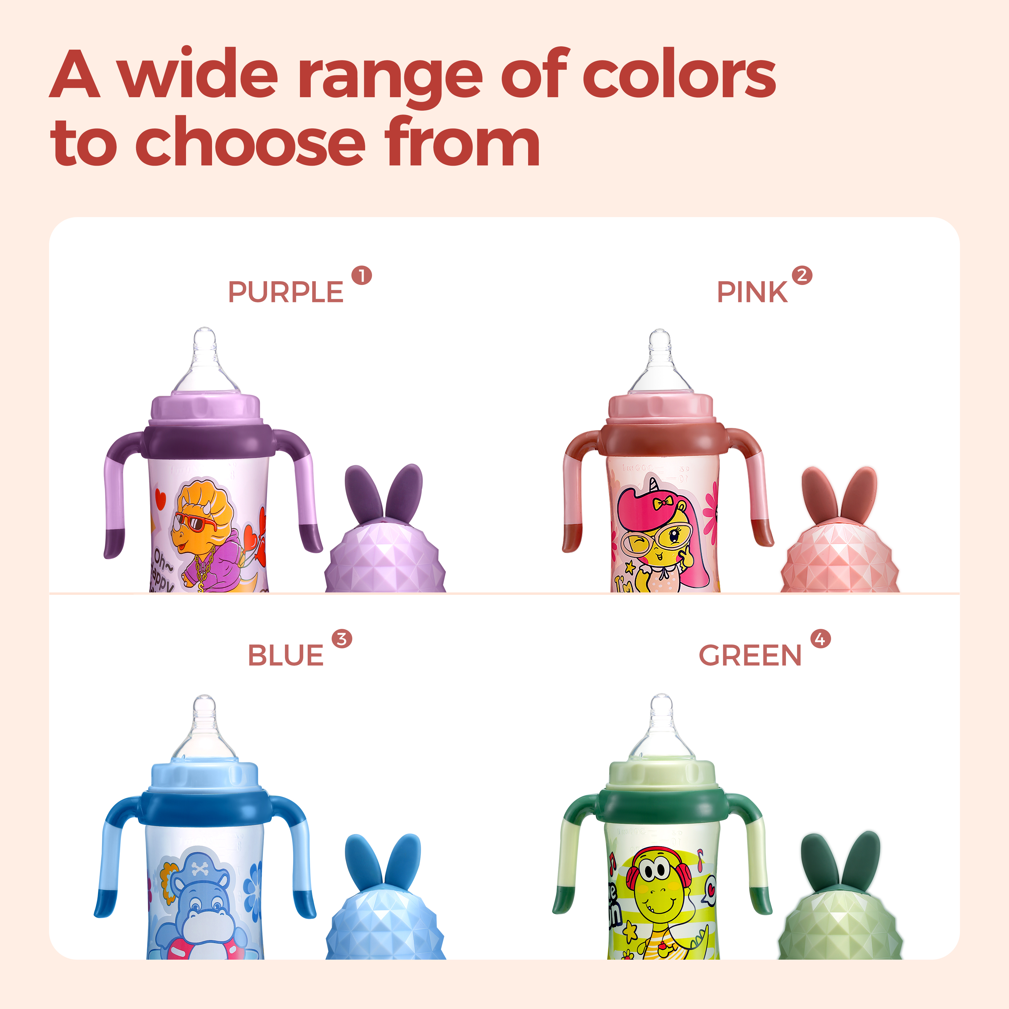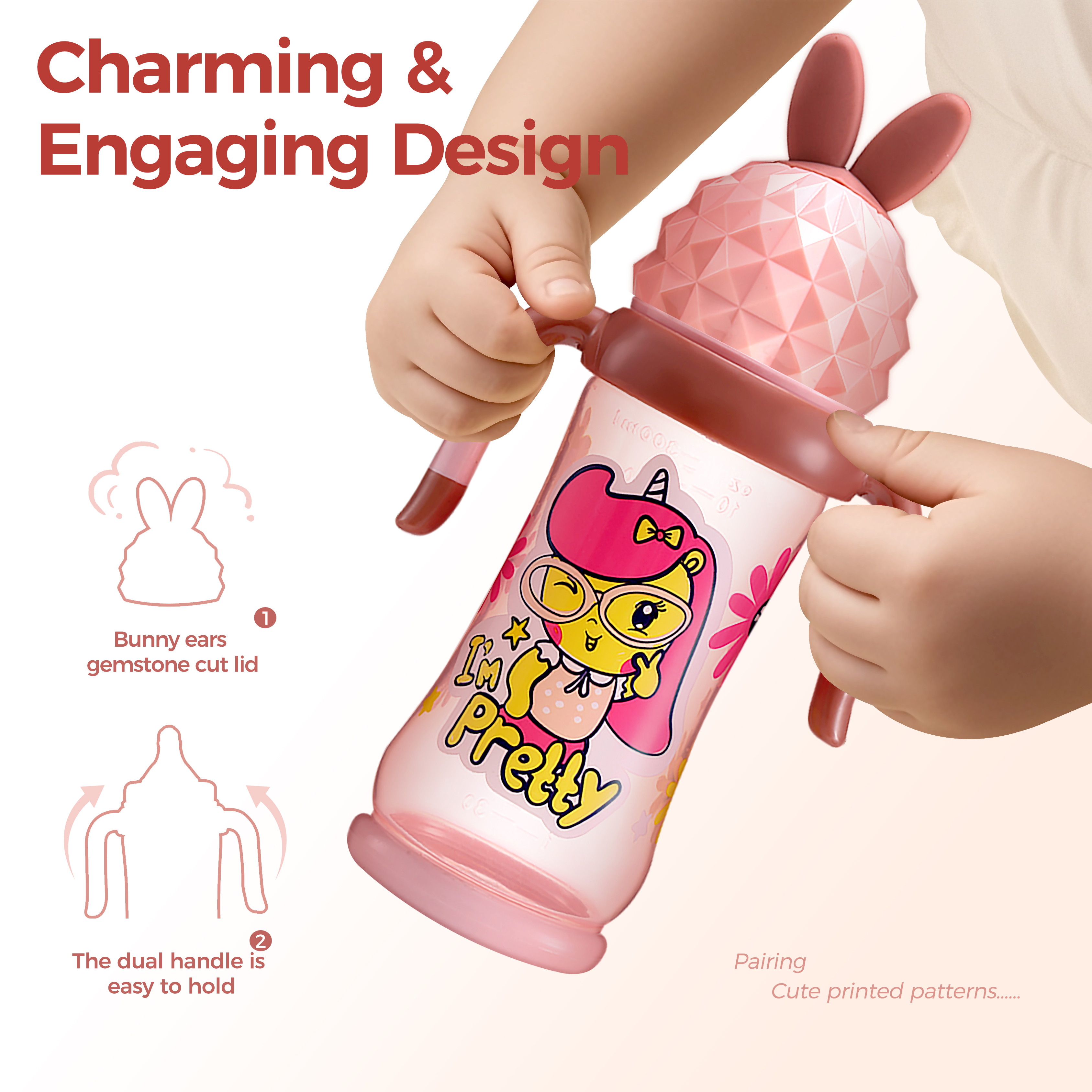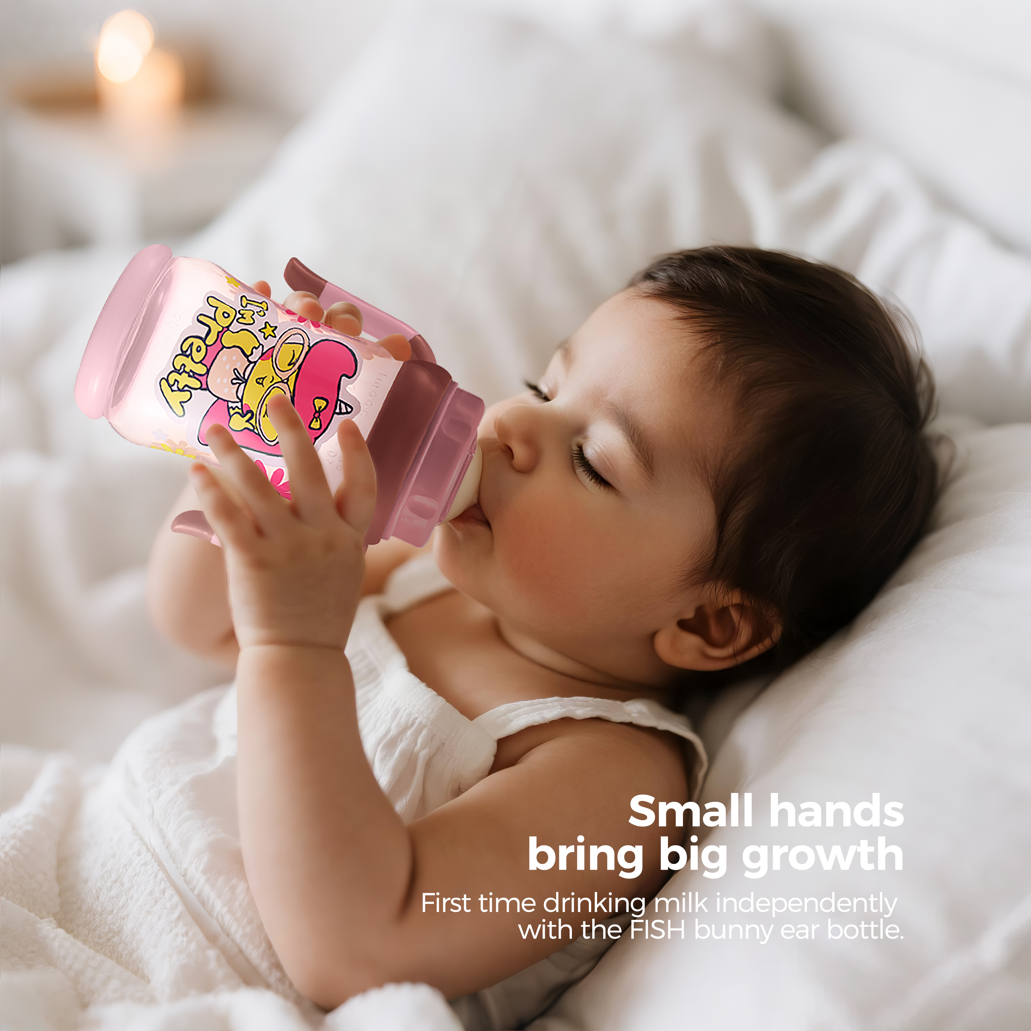 زجاجة FISH Bunny Gem Cap - غطاء بأذنين أرنب ومقبضين مزدوجين، خالية من مادة BPA، مصنوعة من البولي بروبيلين والسيليكون. سعة 240 و300 مل، تدعم الشرب الذاتي (6-18 شهرًا) بألوان باستيل حالمة.