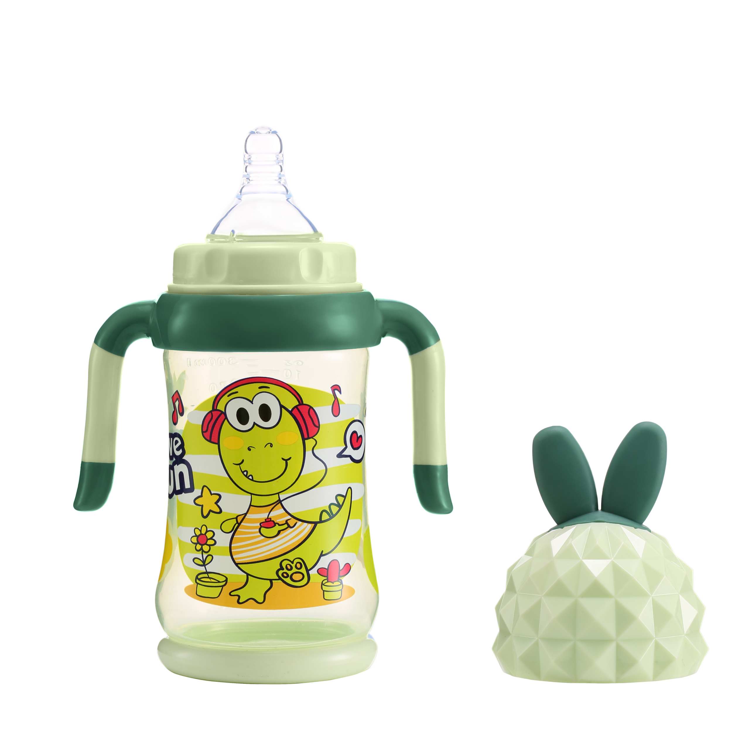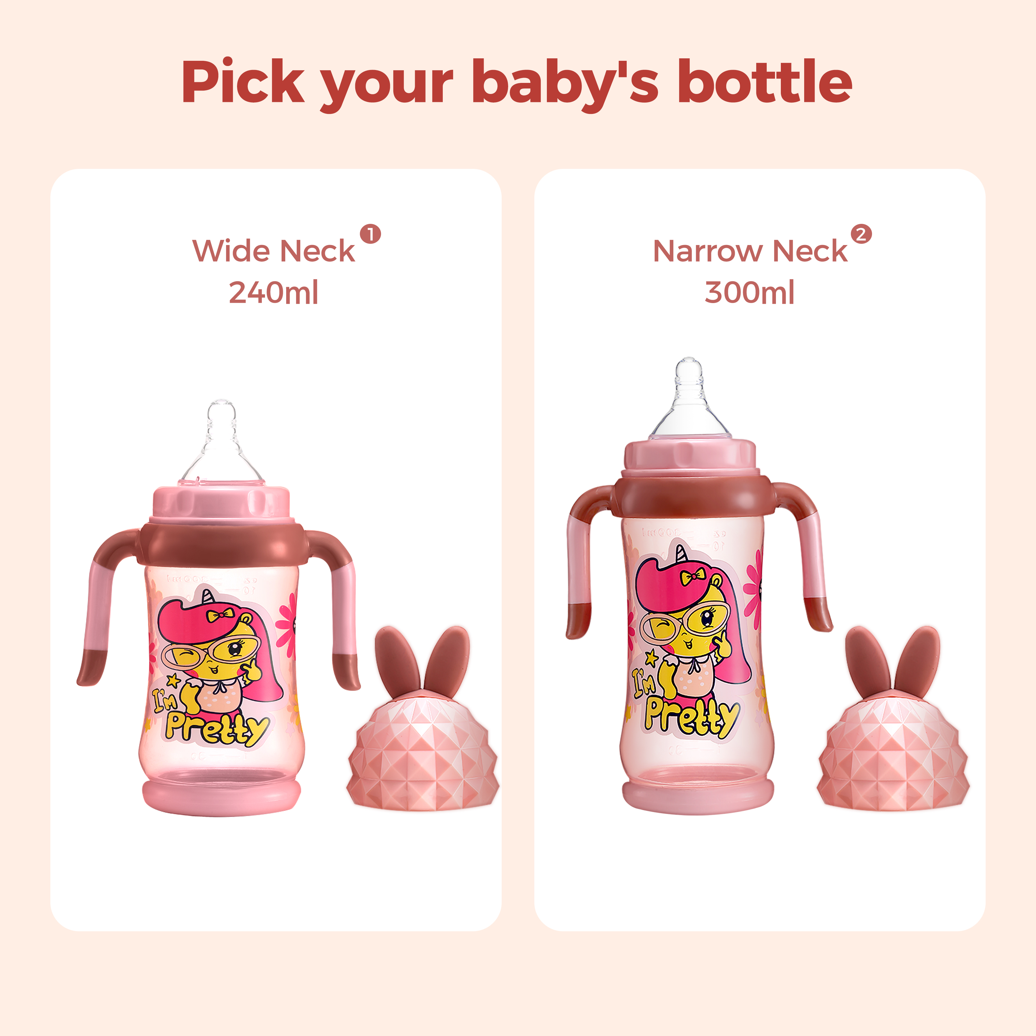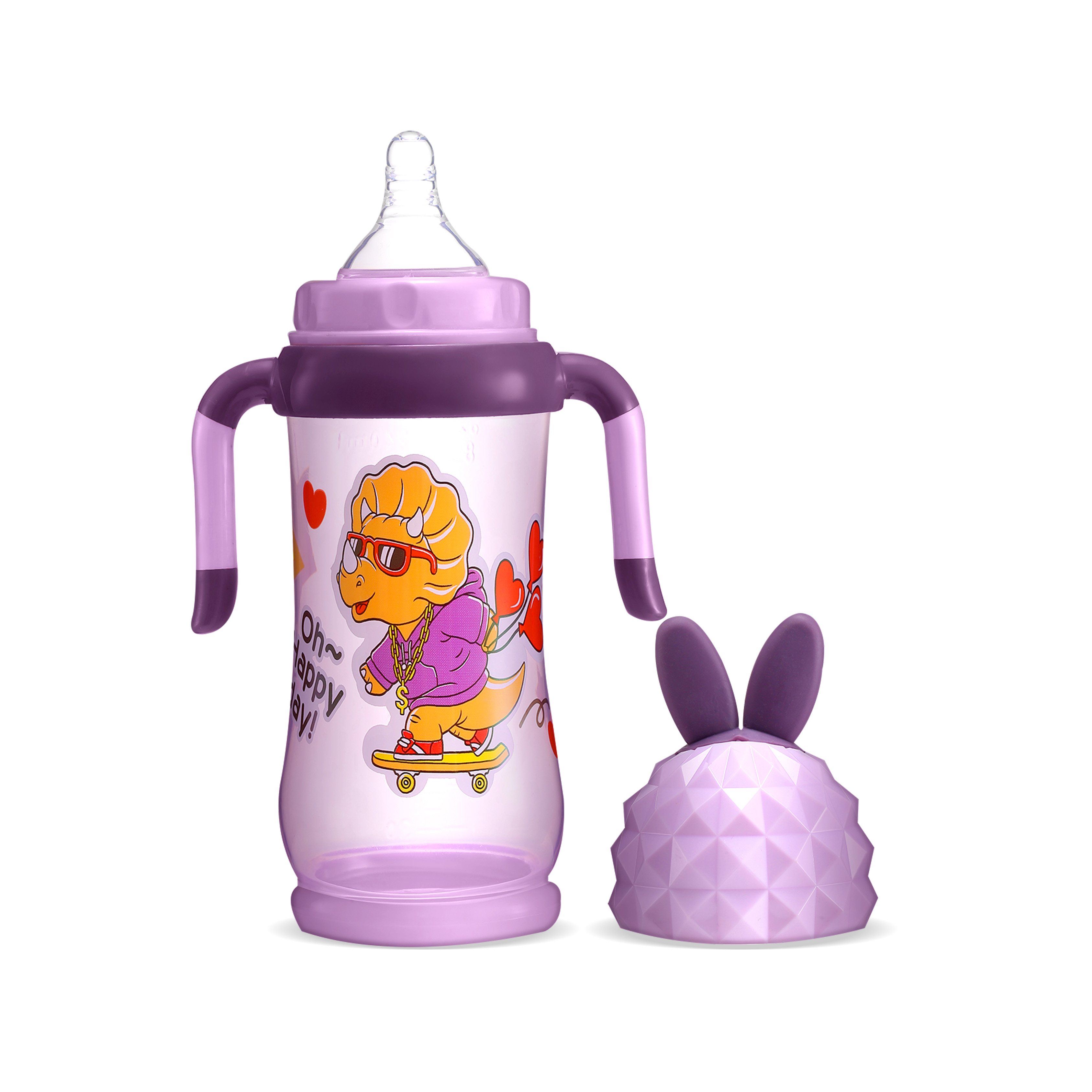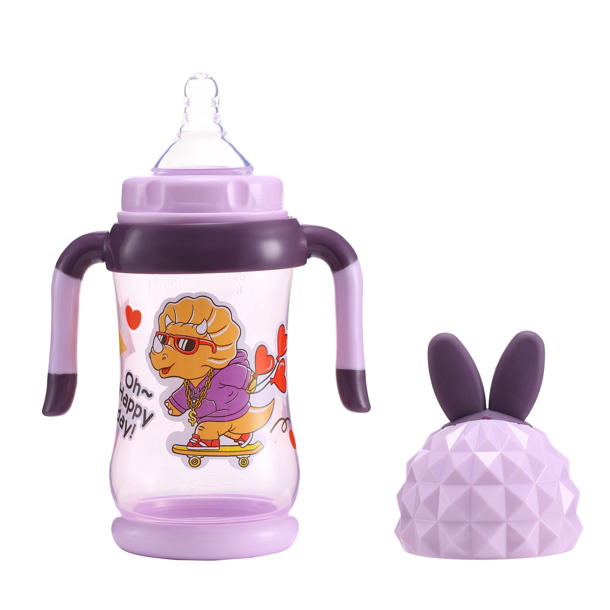 زجاجة FISH Bunny Gem Cap - غطاء بأذنين أرنب ومقبضين مزدوجين، خالية من مادة BPA، مصنوعة من البولي بروبيلين والسيليكون. سعة 240 و300 مل، تدعم الشرب الذاتي (6-18 شهرًا) بألوان باستيل حالمة.