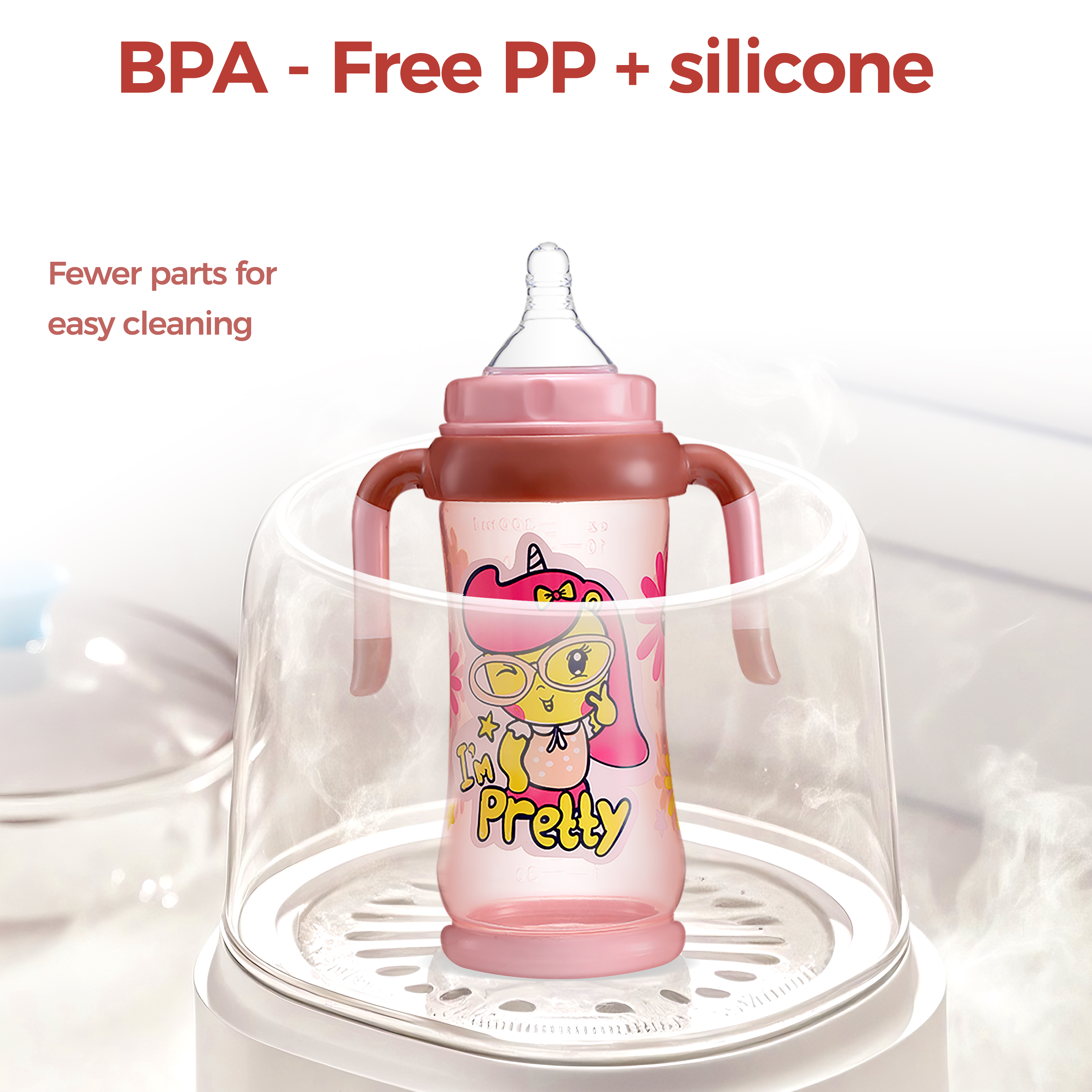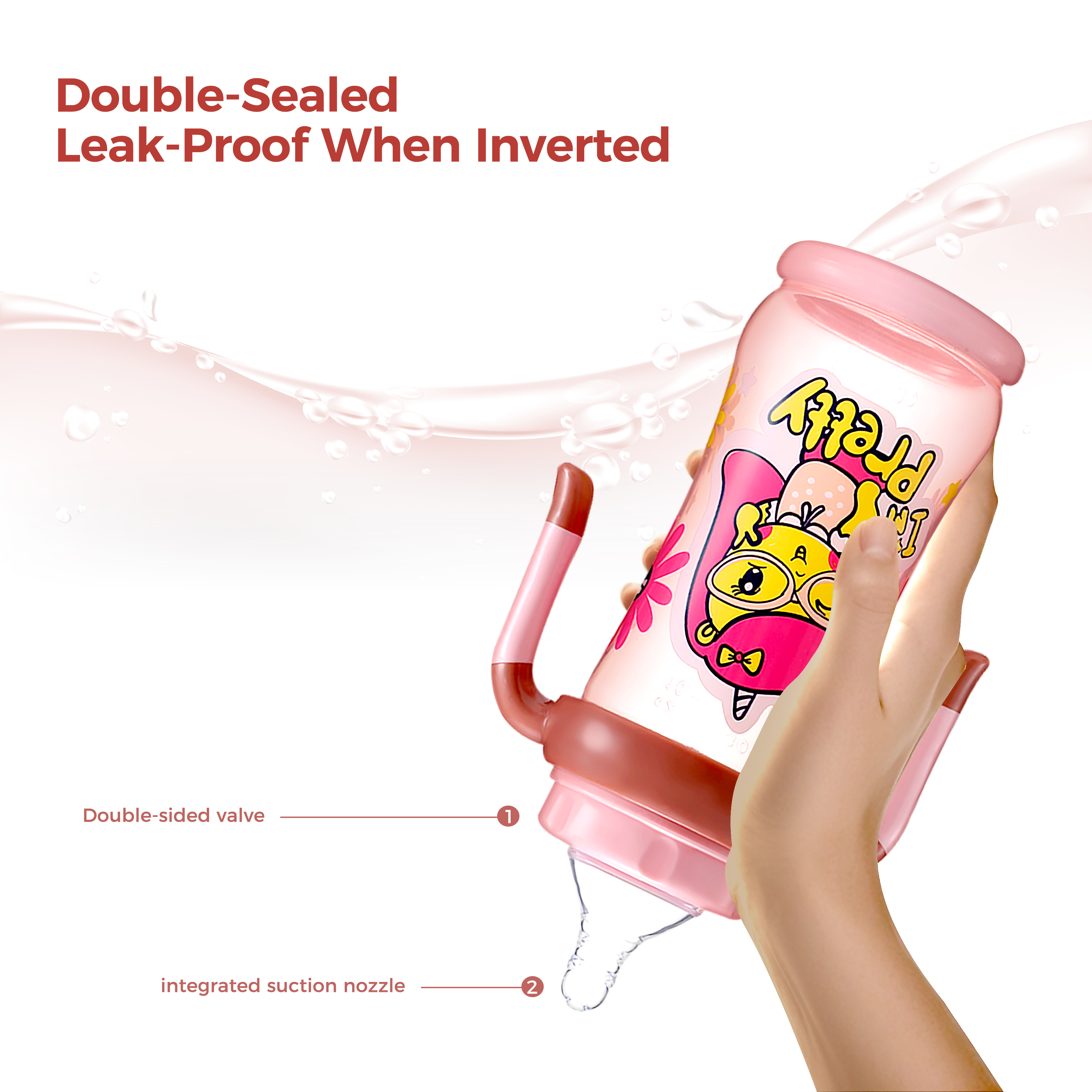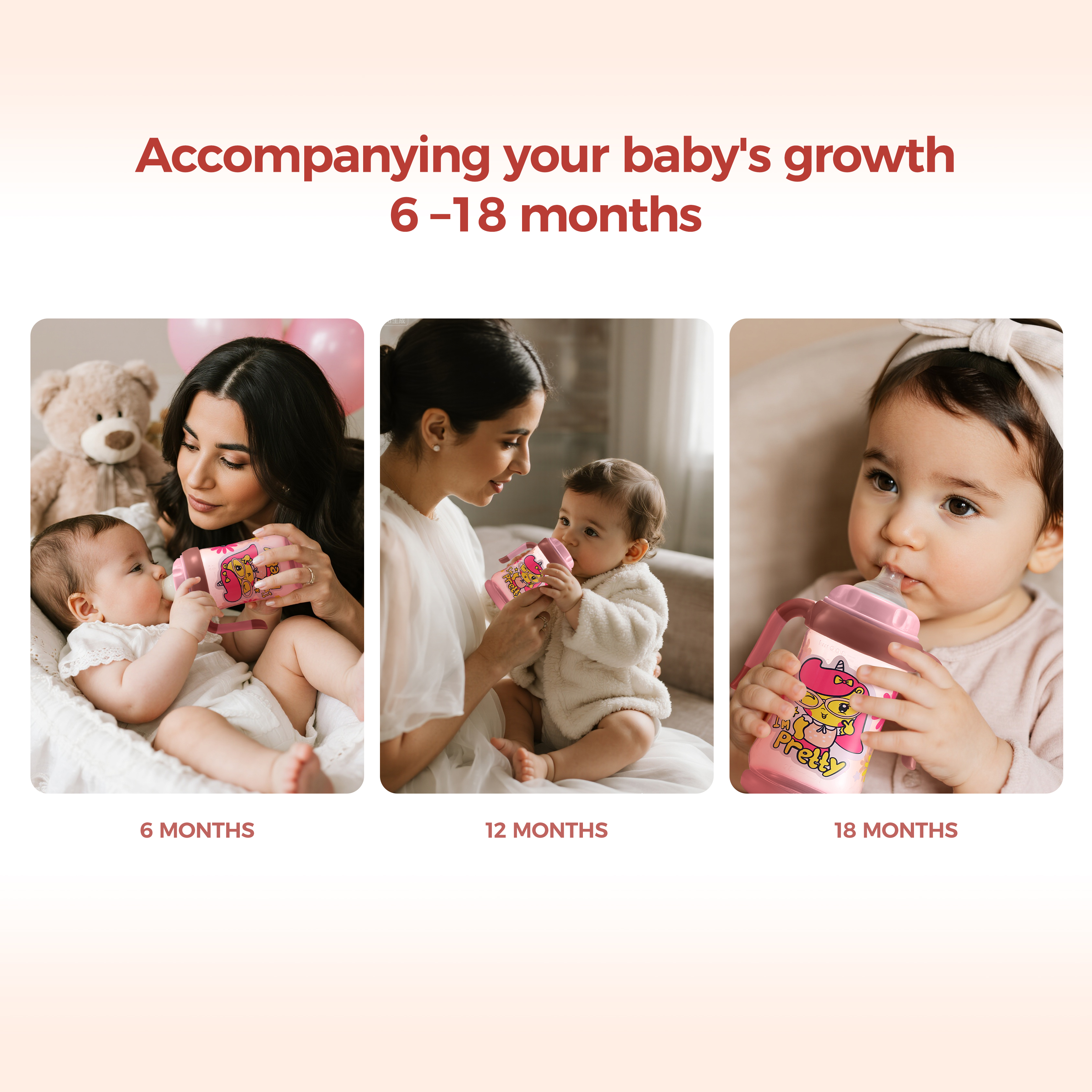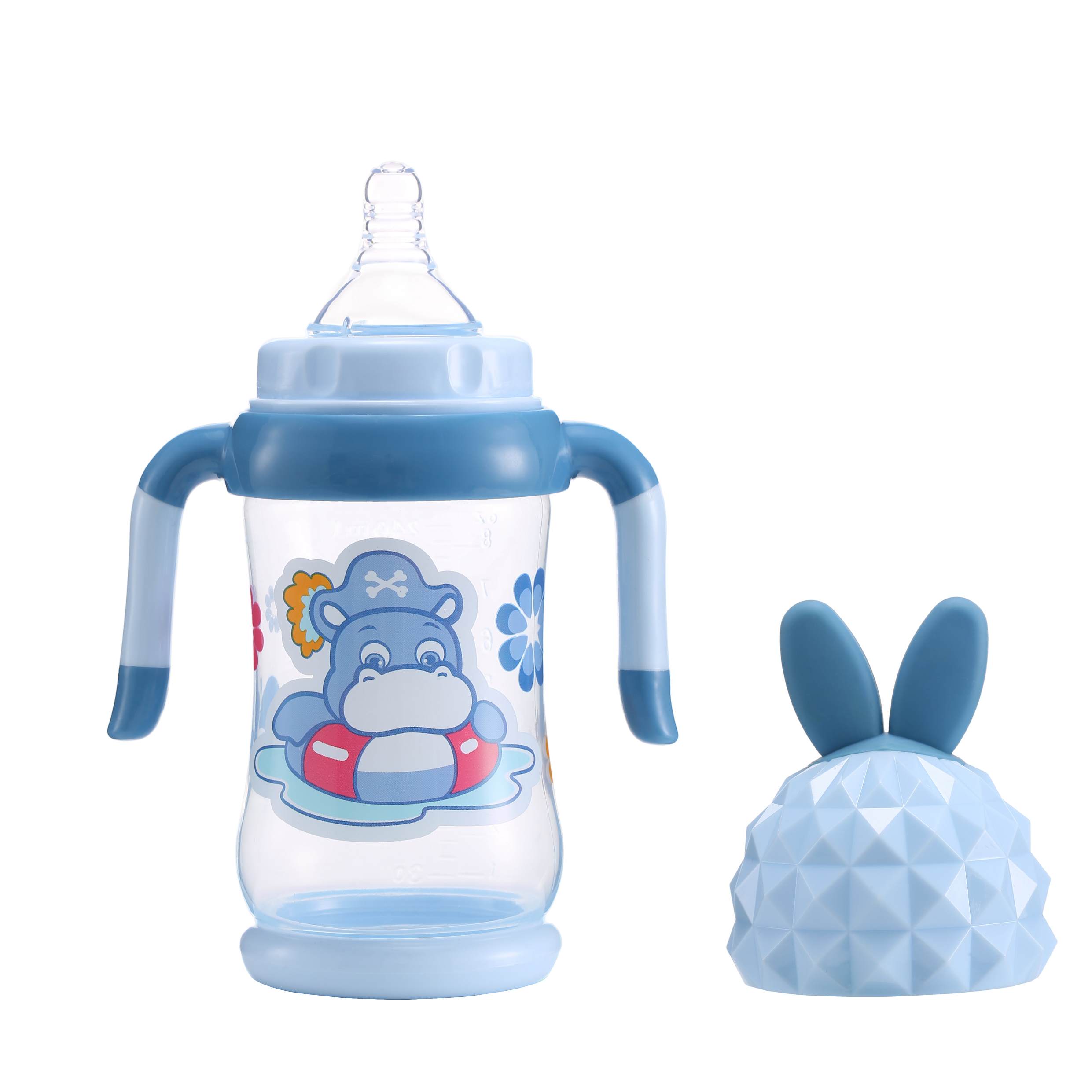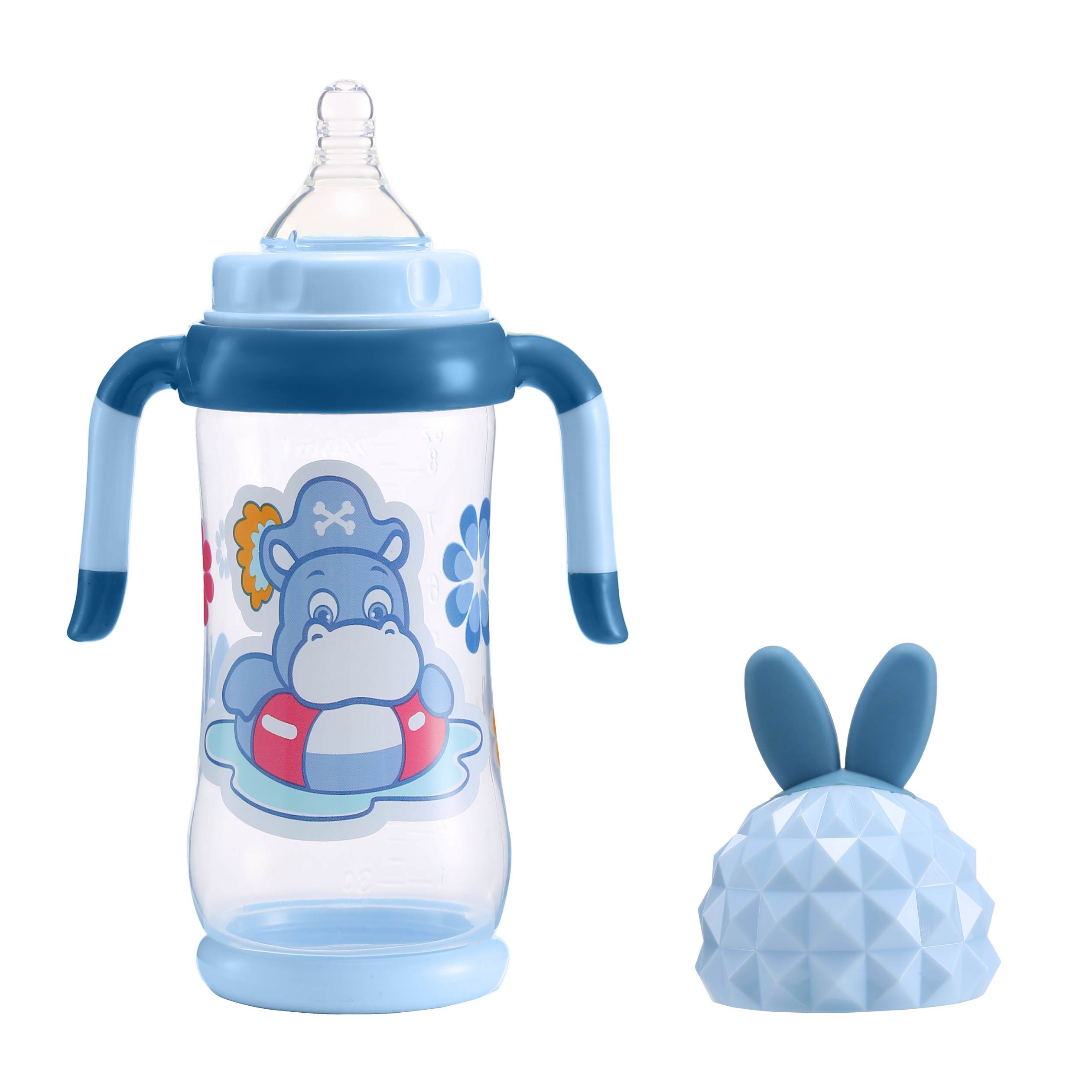 زجاجة FISH Bunny Gem Cap - غطاء بأذنين أرنب ومقبضين مزدوجين، خالية من مادة BPA، مصنوعة من البولي بروبيلين والسيليكون. سعة 240 و300 مل، تدعم الشرب الذاتي (6-18 شهرًا) بألوان باستيل حالمة.