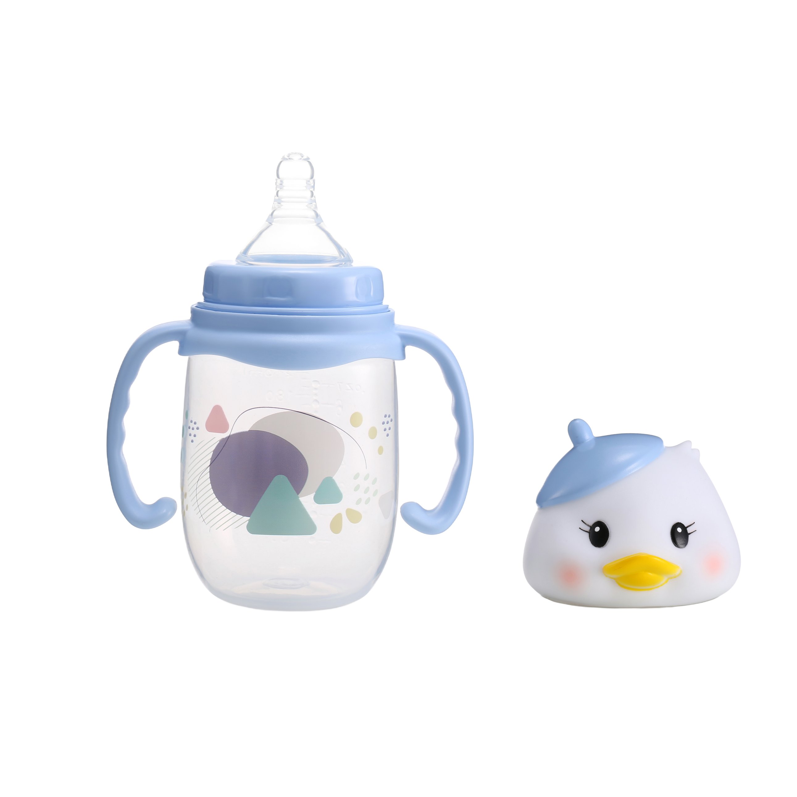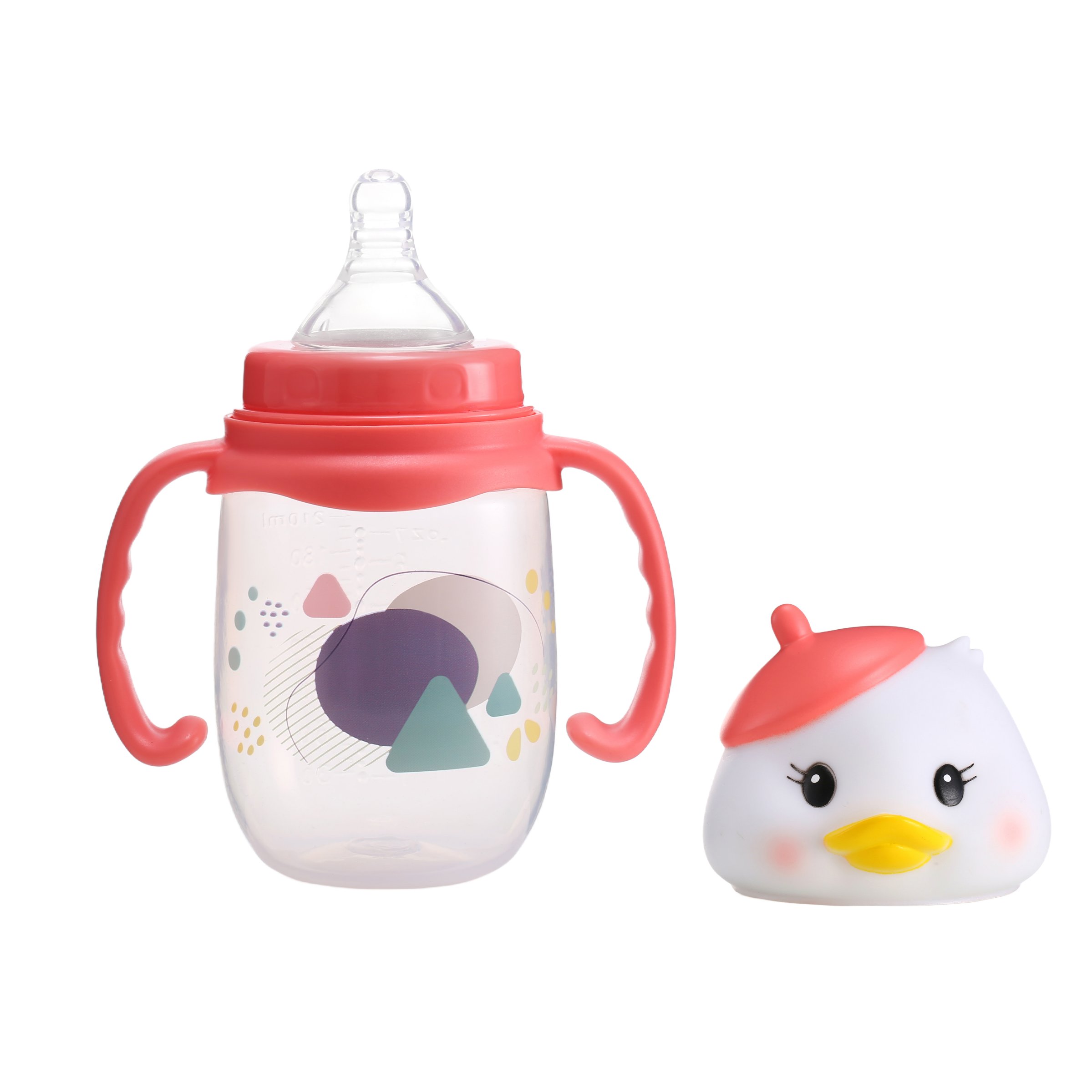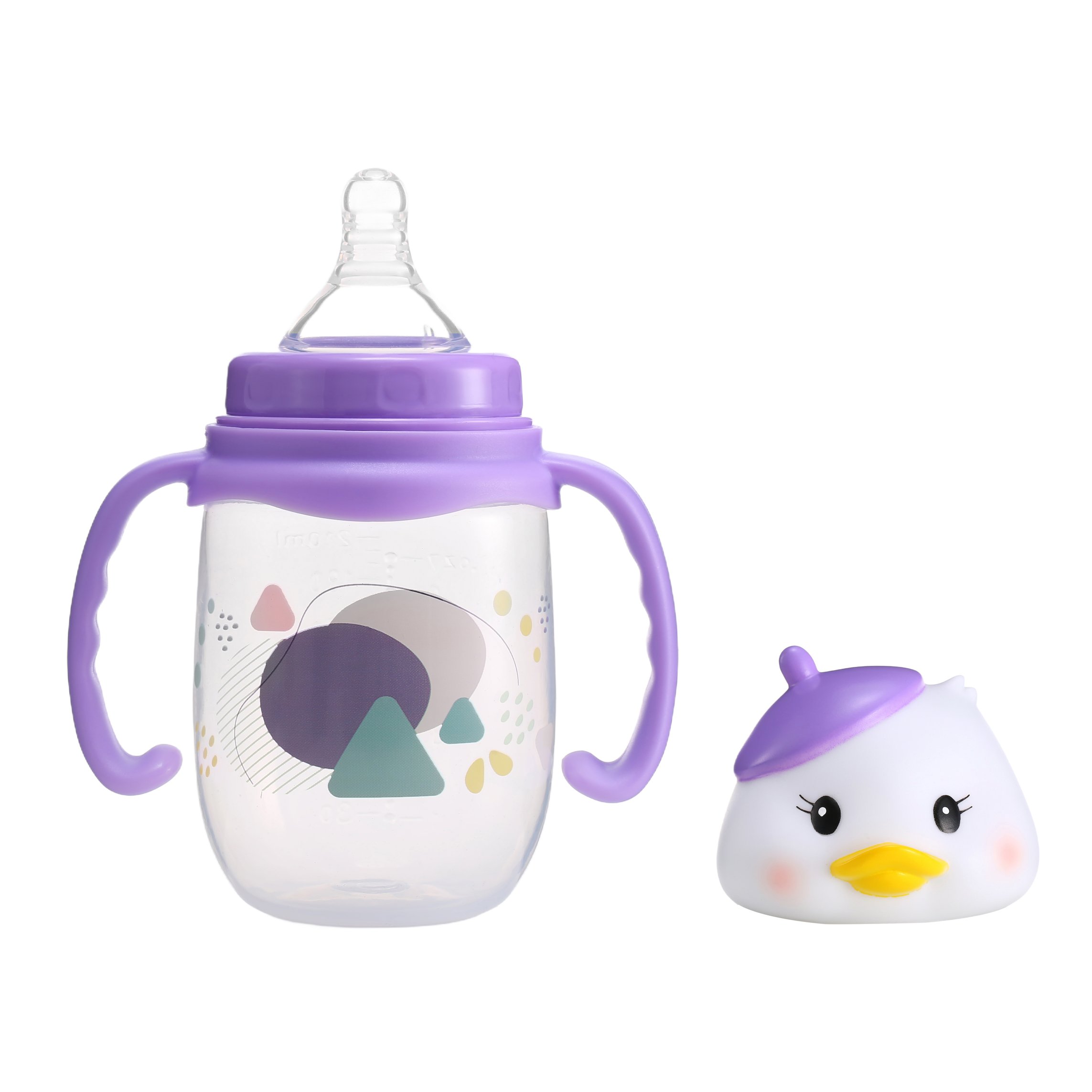 زجاجة على شكل بطة من FISH – تصميم كلاسيكي على شكل رأس بطة! أنماط زاهية، خالية من مادة BPA، مصنوعة من البولي بروبيلين والسيليكون. خيارات 210 مل/300 مل (برتقالي/أزرق/أخضر/أرجواني). للتغذية اليومية للأطفال من عمر 0 إلى 18 شهرًا.