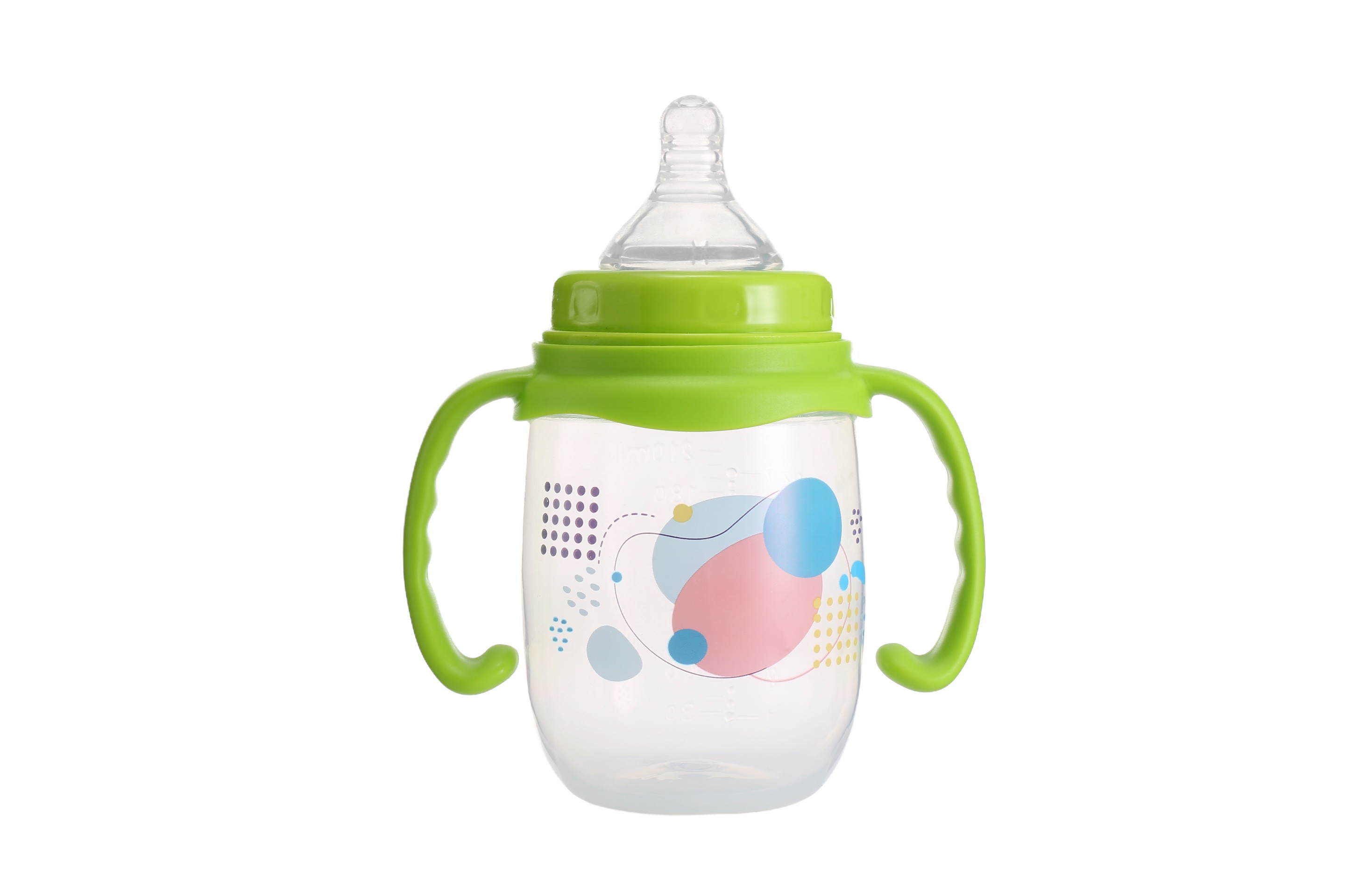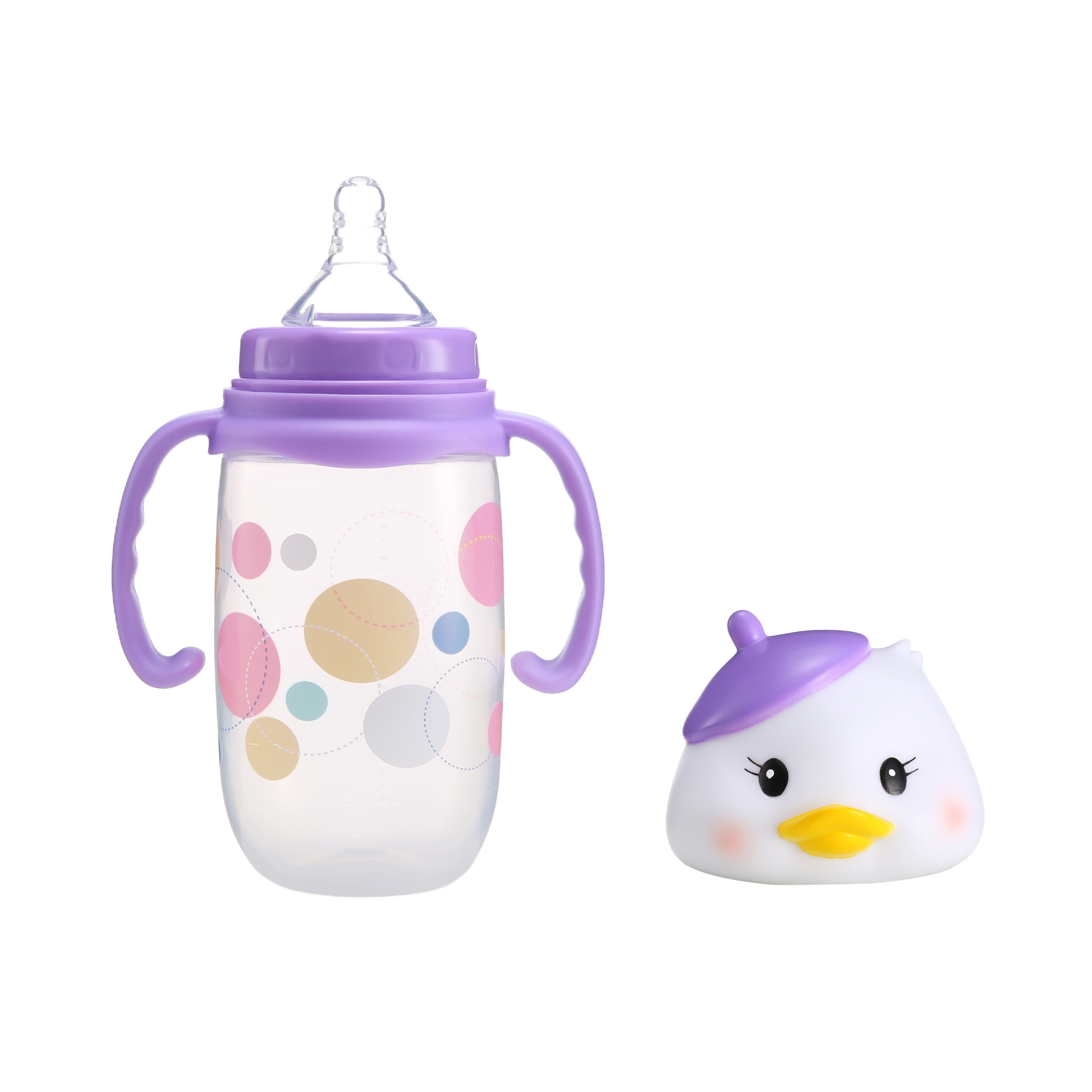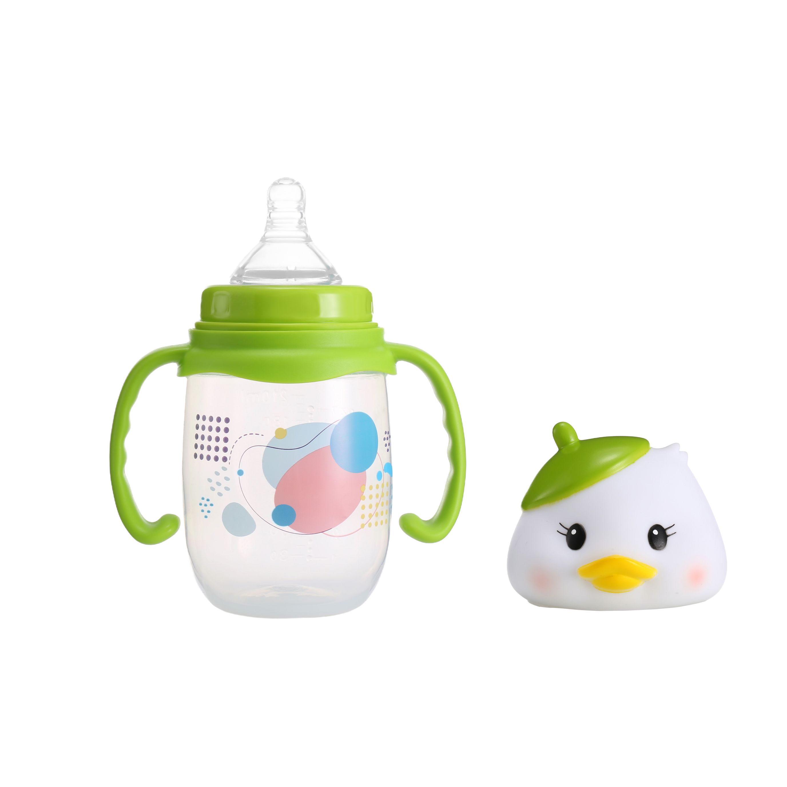 زجاجة على شكل بطة من FISH – تصميم كلاسيكي على شكل رأس بطة! أنماط زاهية، خالية من مادة BPA، مصنوعة من البولي بروبيلين والسيليكون. خيارات 210 مل/300 مل (برتقالي/أزرق/أخضر/أرجواني). للتغذية اليومية للأطفال من عمر 0 إلى 18 شهرًا.