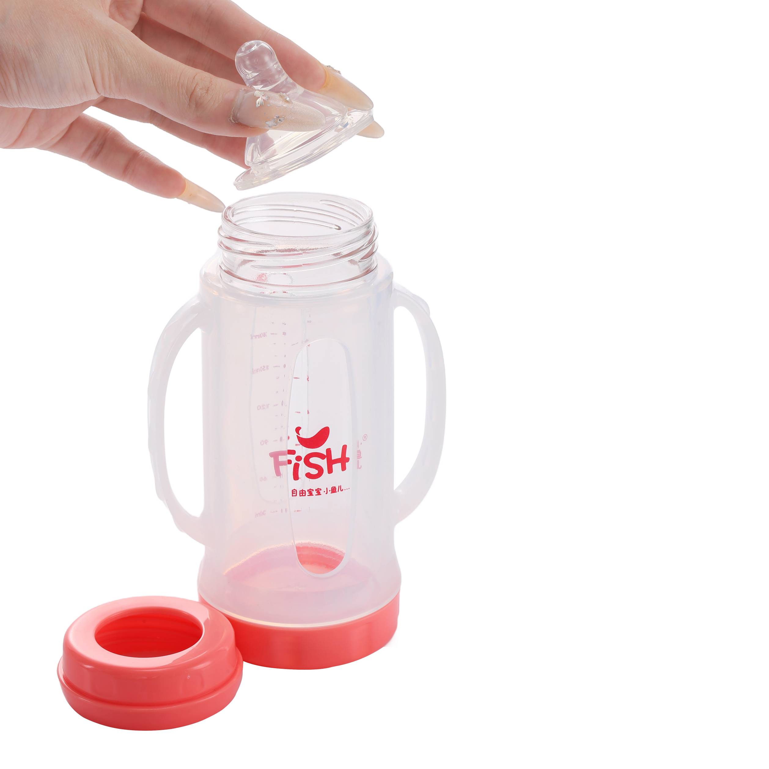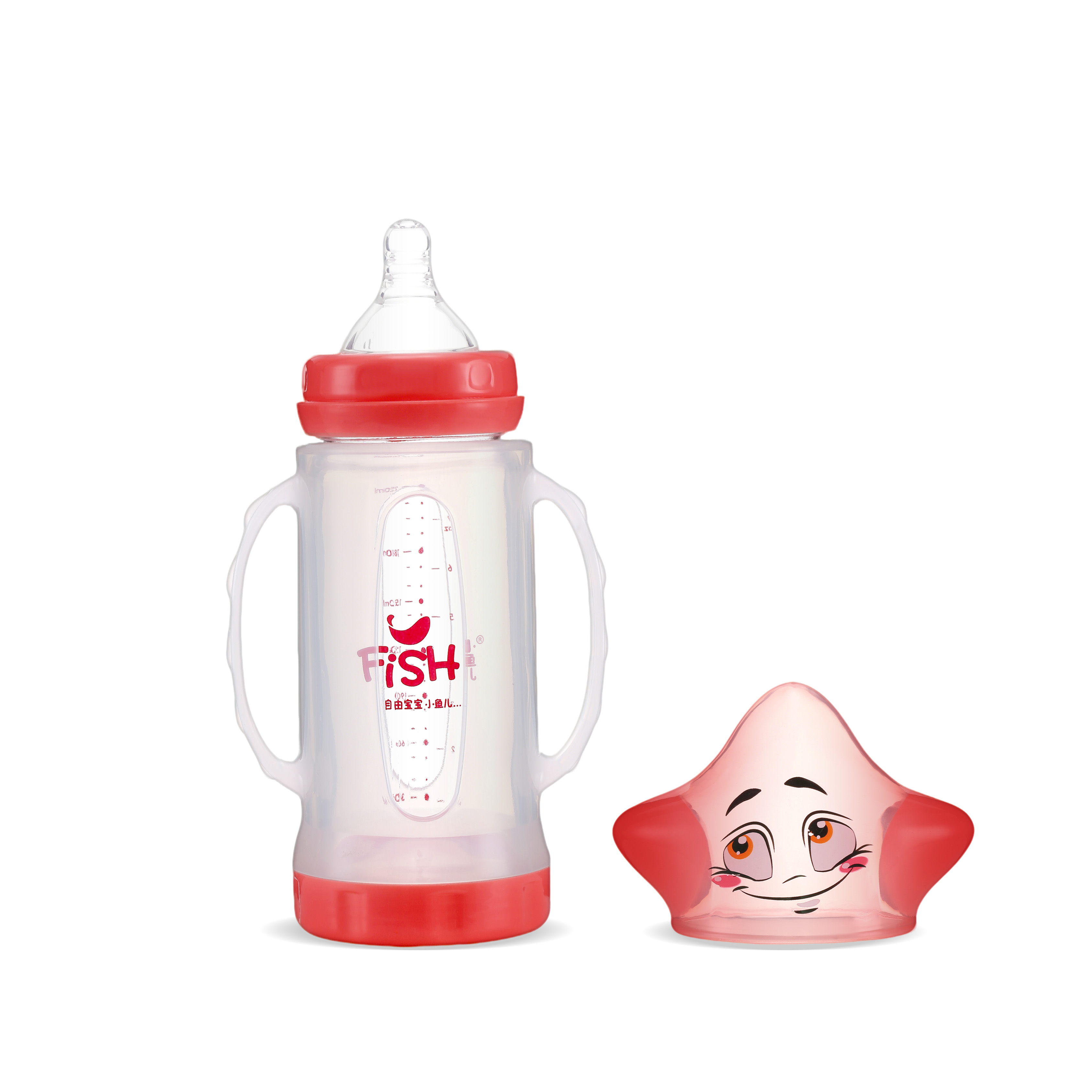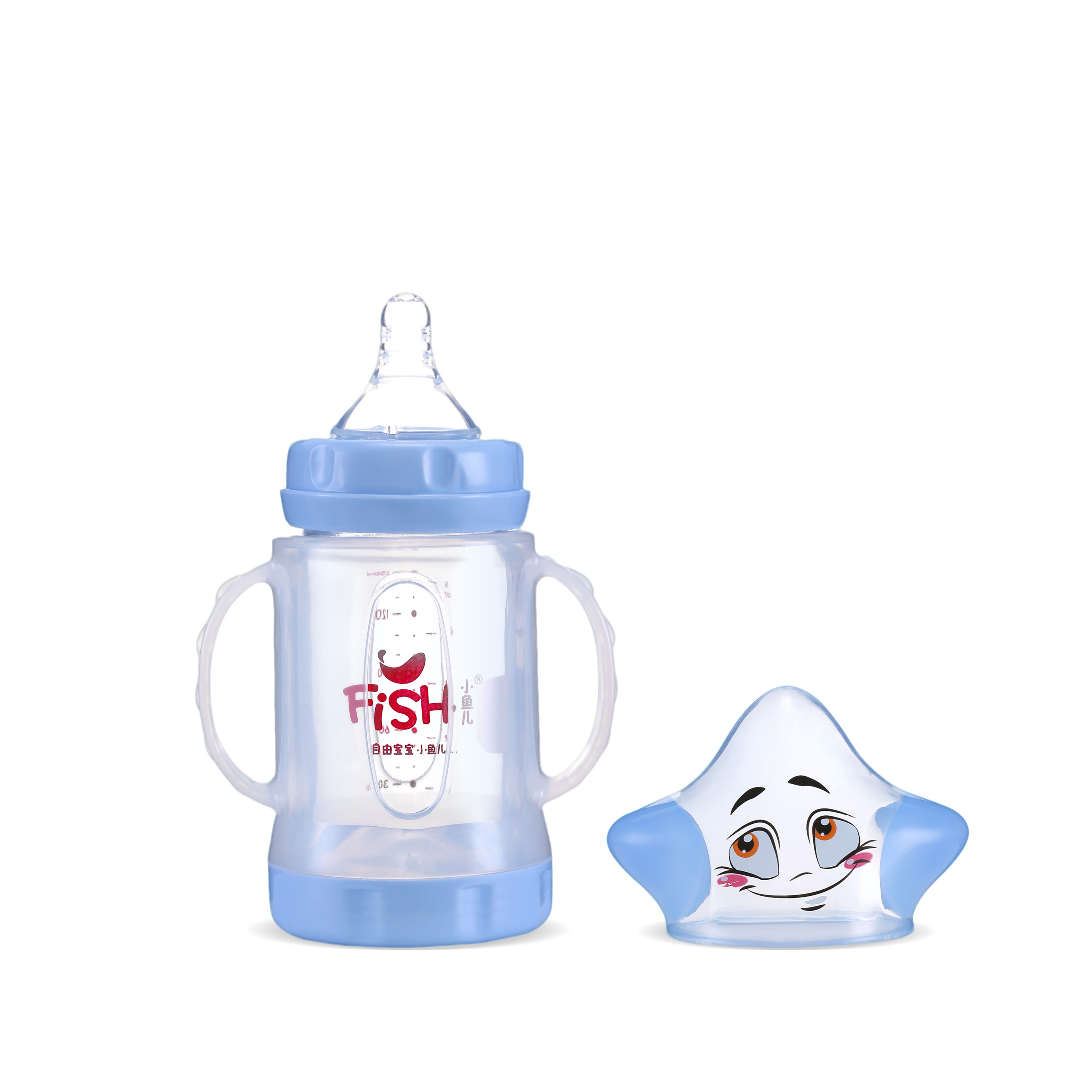 زجاجة FISH Star Smile ذات عنق عريض – غطاء على شكل نجمة متلألئة + قبة شفافة! زجاج بورسليكات، عنق عريض ومقبضان. علامات دقيقة، 150 مل/220 مل باللون الأزرق/الوردي الحالم. أساسية للأطفال من 0 إلى 12 شهرًا.