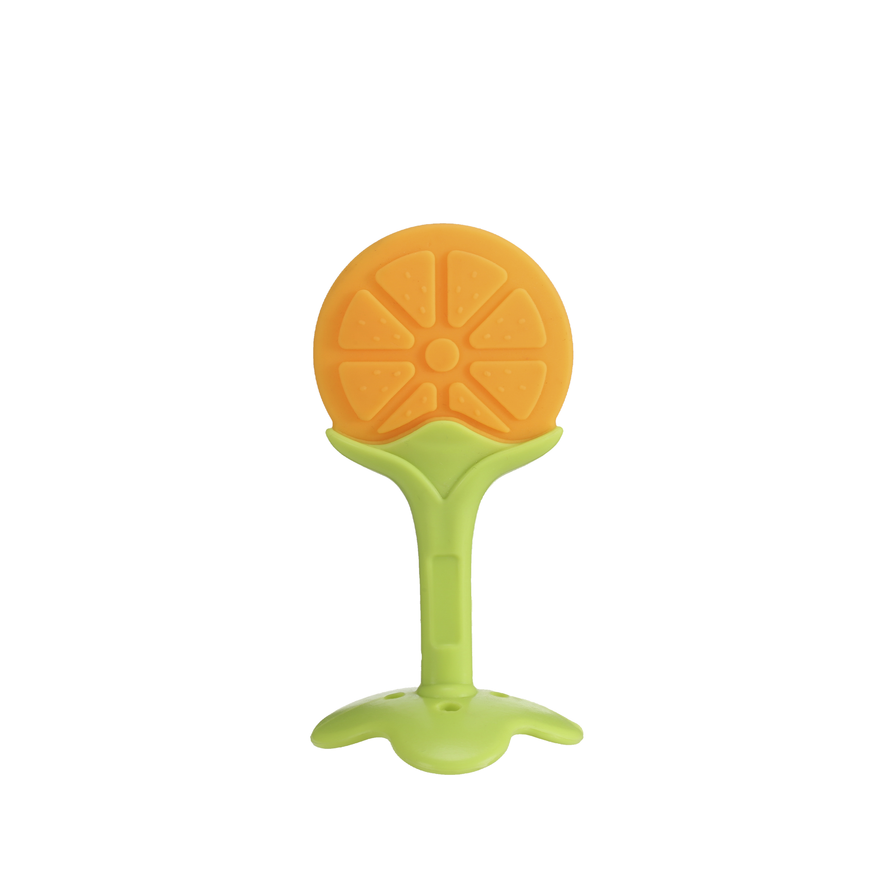 جزء علوي مزخرف على شكل أوراق: الجزء الأخضر المورق به نقاط بارزة لتدليك اللثة وتحفيز اللمس.